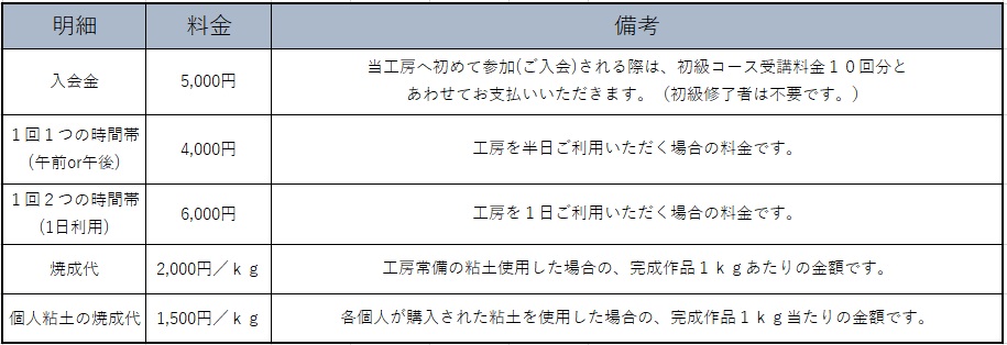 ※教室準備の粘土以外もご注文頂き使用できます。粘土代は実費で焼成代は1500円/kgにてお願いします。 その他、教室での準備品以外の物をご使用の際は、実費のご注文になります。