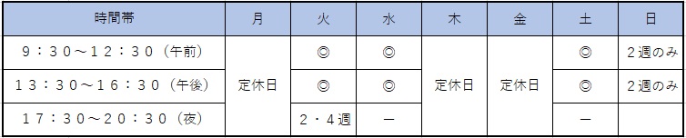 第1週~4週の火曜・水曜・土曜と第2日曜が営業日になります。但し、祭日・年末年始・お盆はお休みです。