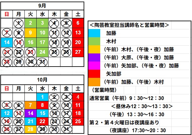 庭瀬陶芸工房の令和7年9・10月の予定表